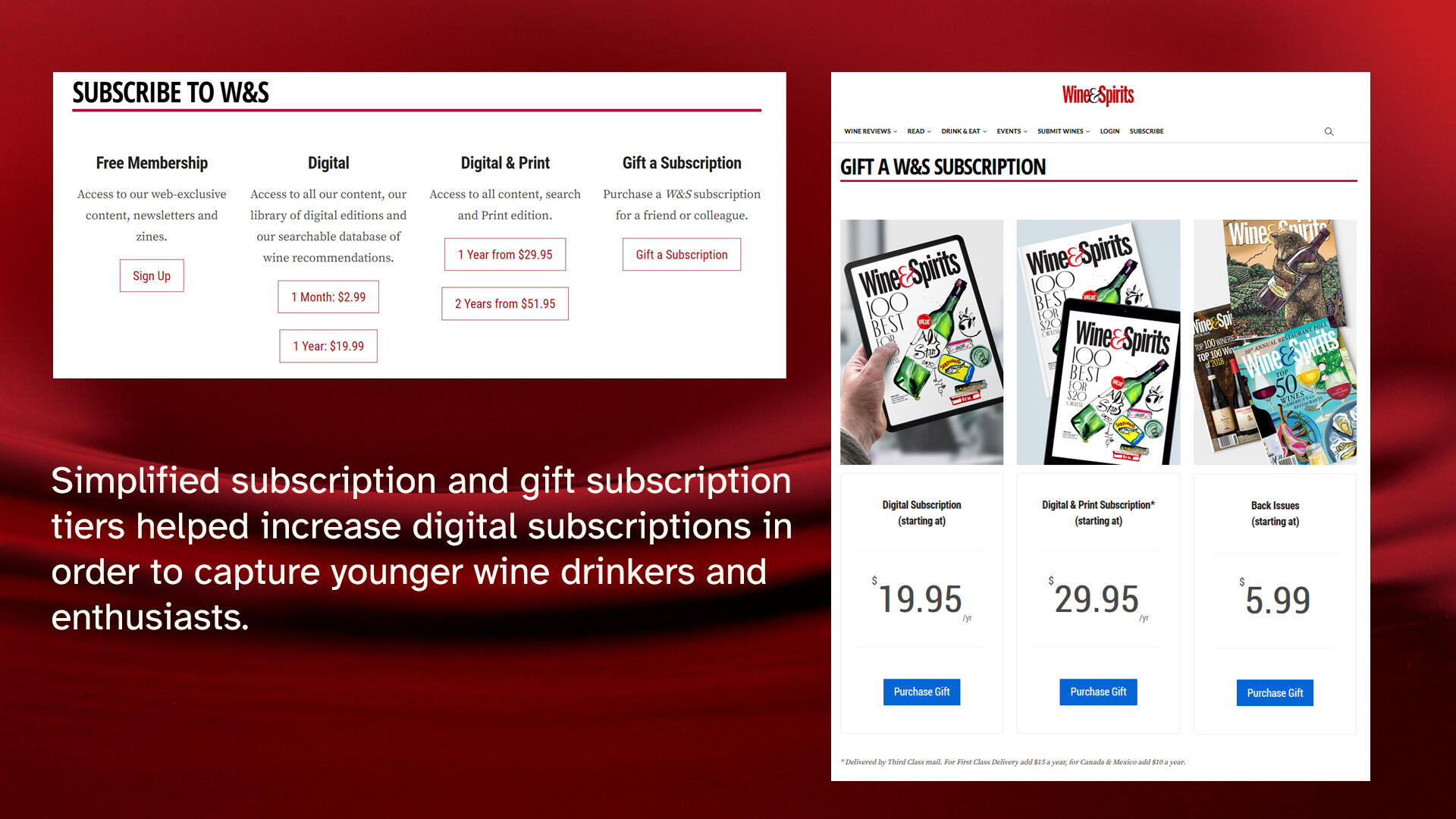The subscription model previously had 6 tiers: print-only and print + digital (a browser-based PDF by a 3rd party company), media subscription, wine industry subscription and a friends and family subscription.When we tested the subscription tiers: